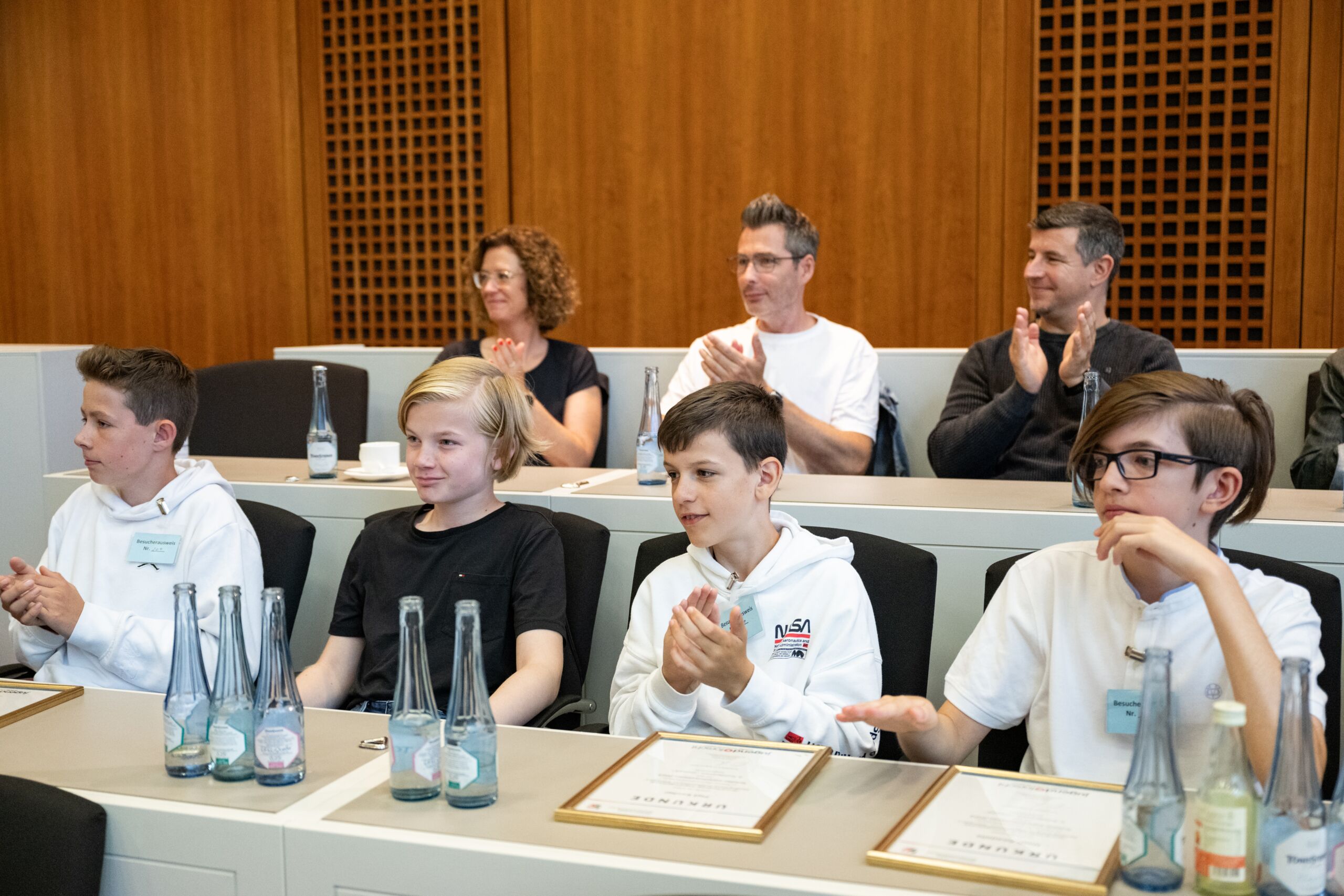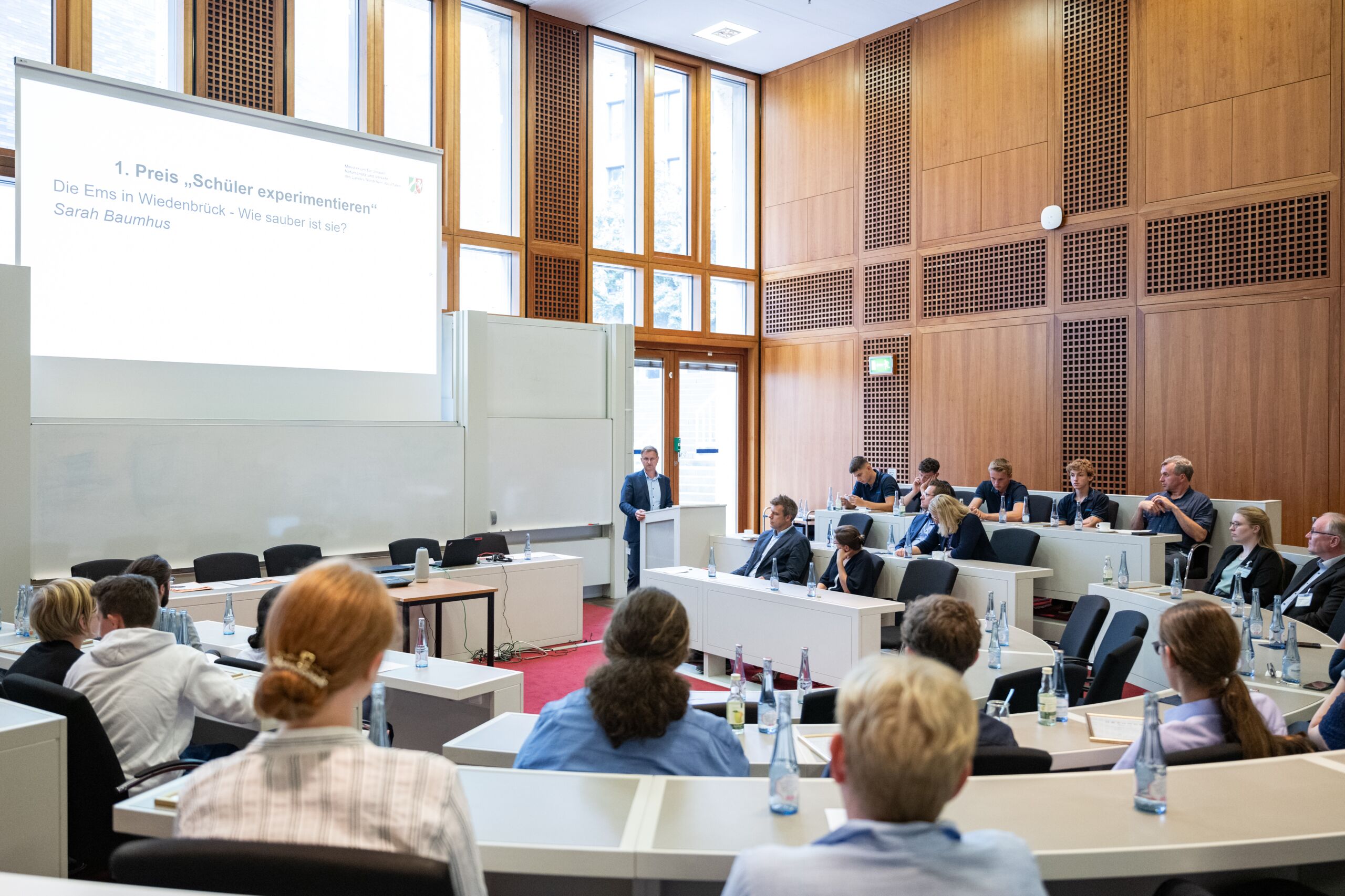 Im Wettbewerb "Schüler experimentieren" ging der dritte Preis an Noah A.[...], Piet K.[...], Jesper D.[...] und Maximilian B.[...] vom Theodor-Heuss-Gymnasium Waltrop für das Projekt "Vertical Gardening: Programmgesteuerte Wandbegrünung im Klassenzimmer". Platz zwei belegte Lucy F.[...] vom Städtischen St. Michael-Gymnasium in Bad Münstereifel mit einem von ihr entwickelten "Symbiose-Pflanzentopf". Den ersten Preis gewann Sarah B.[...] vom Ratsgymnasium Rheda-Wiedenbrück mit ihrer Untersuchung "Die Ems in Wiedenbrück - wie sauber ist sie?".