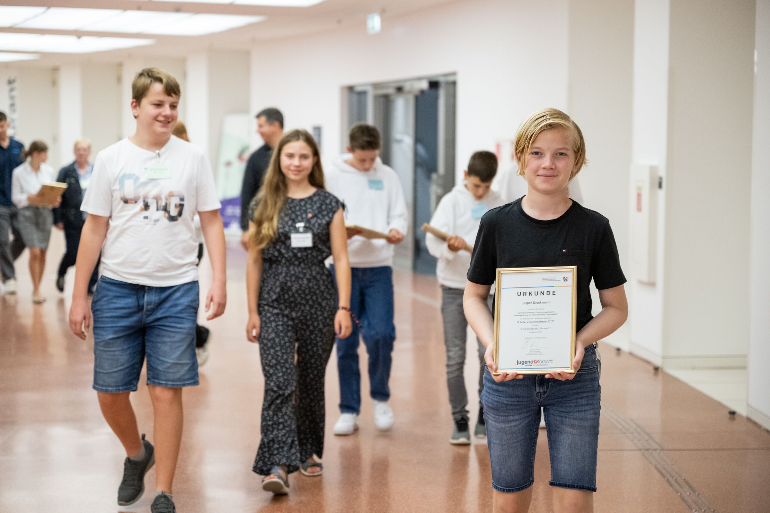 "Ich bin beeindruckt vom kreativen Geist der hoch motivierten jungen Forscherinnen und Forscher. Sie haben sich Zukunftskompetenzen im Sinne einer Bildung für nachhaltige Entwicklung angeeignet und bei ihren Projekten immer die planetaren Grenzen und eine nachhaltige Lebensweise im Hinterkopf gehabt", betonte Minister Oliver Krischer. Die Preisträgerinnen und Preisträger befassten sich mit Fragestellungen auf den Gebieten der nachhaltigen Land- und Gartenwirtschaft, ökologischen Luftreinhaltung, Abbau von Mikroplastik und Bodenbelastung durch Zink.