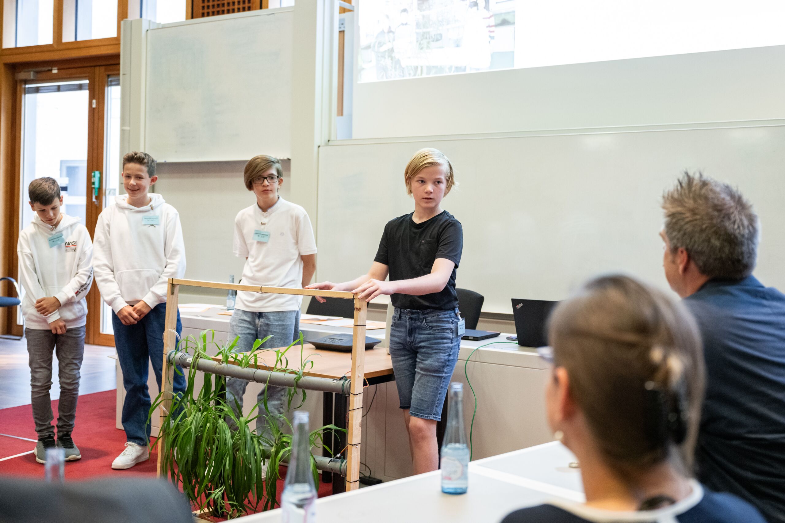 3. Preis (125 Euro): Die vier Schüler Noah A.[...], Piet K.[...], Maximilian B.[...] und Jesper D.[...] haben zusammen mit einer zweiten Projektgruppe ein System zur Begrünung von Klassenzimmern entwickelt. Mit technischem Geschick haben sie ein Gestell mit integrierten Röhren konstruiert. Diese Röhren sind mit einem mineralischen Substrat gefüllt, in das Grünlilien gepflanzt wurden. Die Röhren werden automatisch bewässert und mit Nährstoffen versorgt. Auch die Beleuchtung wird automatisch gesteuert. Mit dieser Entwicklung wollen sie die Atmosphäre und Luftqualität im Klassenzimmer verbessern. Auch andere Räume lassen sich damit ausstatten. Nicht nur an sommerlichen Hitzetagen stellt diese Entwicklung so einen Beitrag zur nachhaltigen Luftreinhaltung in Innenräumen dar.