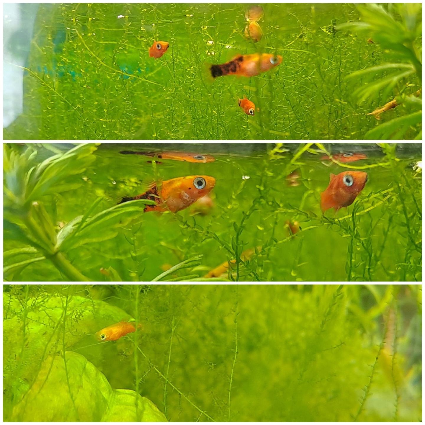 In der Aquaristik sind in den Ferien viele neue Fische geboren worden. Die Platys sind ca. 24 Tage lang trächtig und gebären viele Jungtiere gleichzeitig. Zu Beginn fallen die Babys durch ihre sehr großen Augen auf.