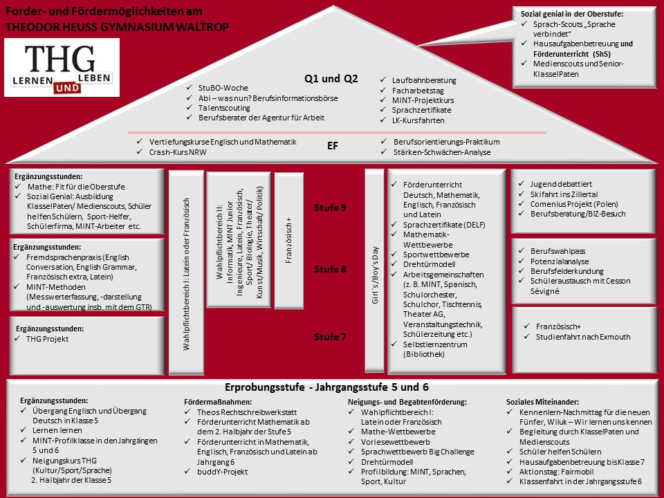 Die individuelle Förderung aller Schülerinnen und Schüler ist die zentrale Leitidee des Schulgesetzes von 2006 in NRW. Das Ziel ist die bestmögliche Förderung aller Kinder. Die vom Schulgesetz formulierten Handlungsfelder der individuellen Förderung werden am THG mit einer empfohlene Schwerpunksetzung in den Feldern „Mit der Vielfalt umgehen – Stärken stärken“ und „Übergänge und Lernbiographien bruchlos gestalten“ im Rahmenkonzept für individuelle Förderung am THG umgesetzt. Um diese Aufgaben zu realisieren, beinhaltet das Fördern und Fordern-Konzept des THG zahlreiche Elemente, die sich an alle Schülerinnen und Schüler richtet und zum Teil fester Bestandteil des Fachunterrichts sind: