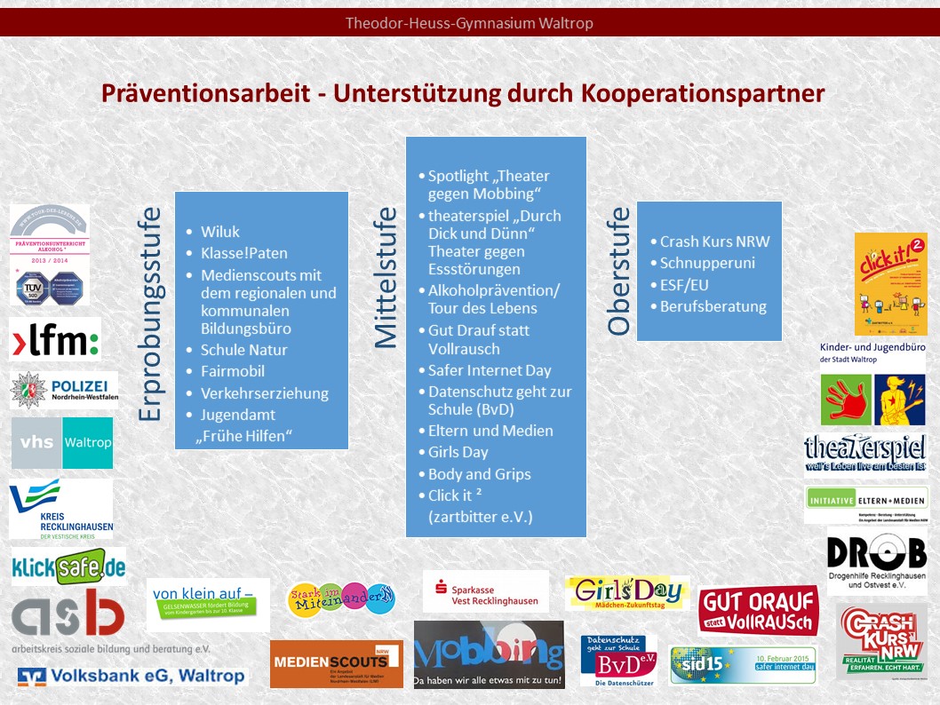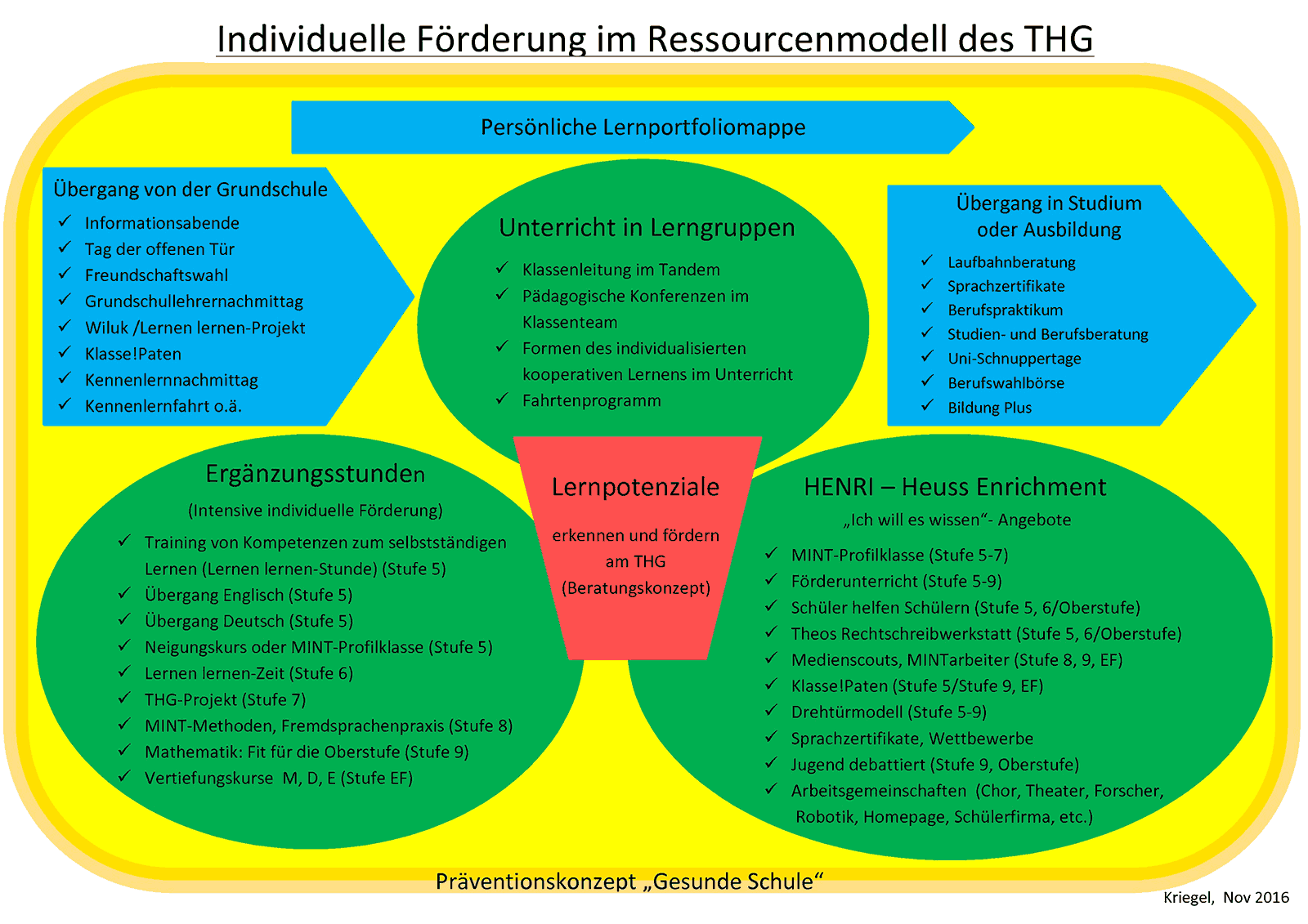 Das Ressourcenmodell zur individuellen Förderung am THG zeigt eine Übersicht zu den vielfältigen Elementen individueller Förderung auf der Basis eines lernförderlichen Schulklimas. Dieses wird gestärkt durch aufeinander abgestimmte begleitende Maßnahmen und Angebote zur Förderung des sozialen Lernens und der Persönlickeitsentwicklung – u.a. dem Konzept für eine gute „Gesunde Schule“ und unserer Präventionsarbeit mit unseren Kooperationspartnern und Beratungskonzept in dem unsere Klassenpaten und den speziell ausgebildeten Medienscouts besonders eingebunden sind.