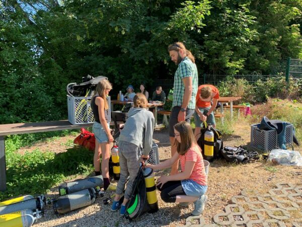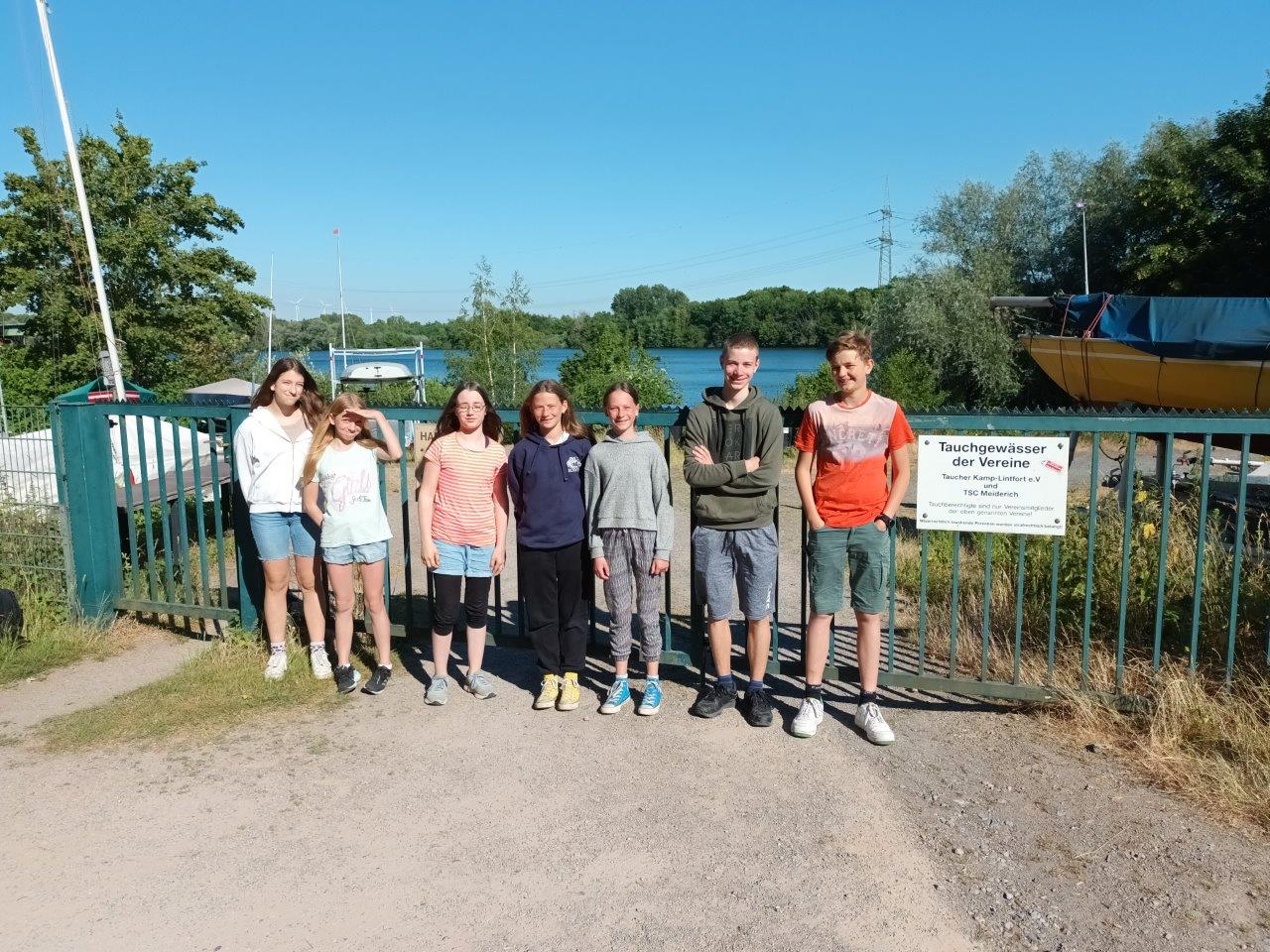 Ein Schuljahr haben die SchülerInnen im Schwimmbad das Tauchen mit einem Drucklufttauchgerät (kurz: DTG) gelernt und konnten nun in Duisburg-Baerl endlich das neue Wissen im Freiwasser anwenden. Bei sonnigem Wetter gingen es in das klare, warme Wasser des Lohheider Sees. Die SchülerInnen haben ihr Tauchgerät (Jacket, Druckluftflasche und Atemregler) natürlich selbstständig zusammengebaut, bevor sie mit Neoprenanzug, Blei und DTG in neue Welten eintauchten. In 5m Tiefe wurden dann verschiedene Übungen absolviert. Alle SchülerInnen waren von der Unterwasserwelt fasziniert und nach dem Tauchgang wurden die Erfahrungen ausgetauscht.