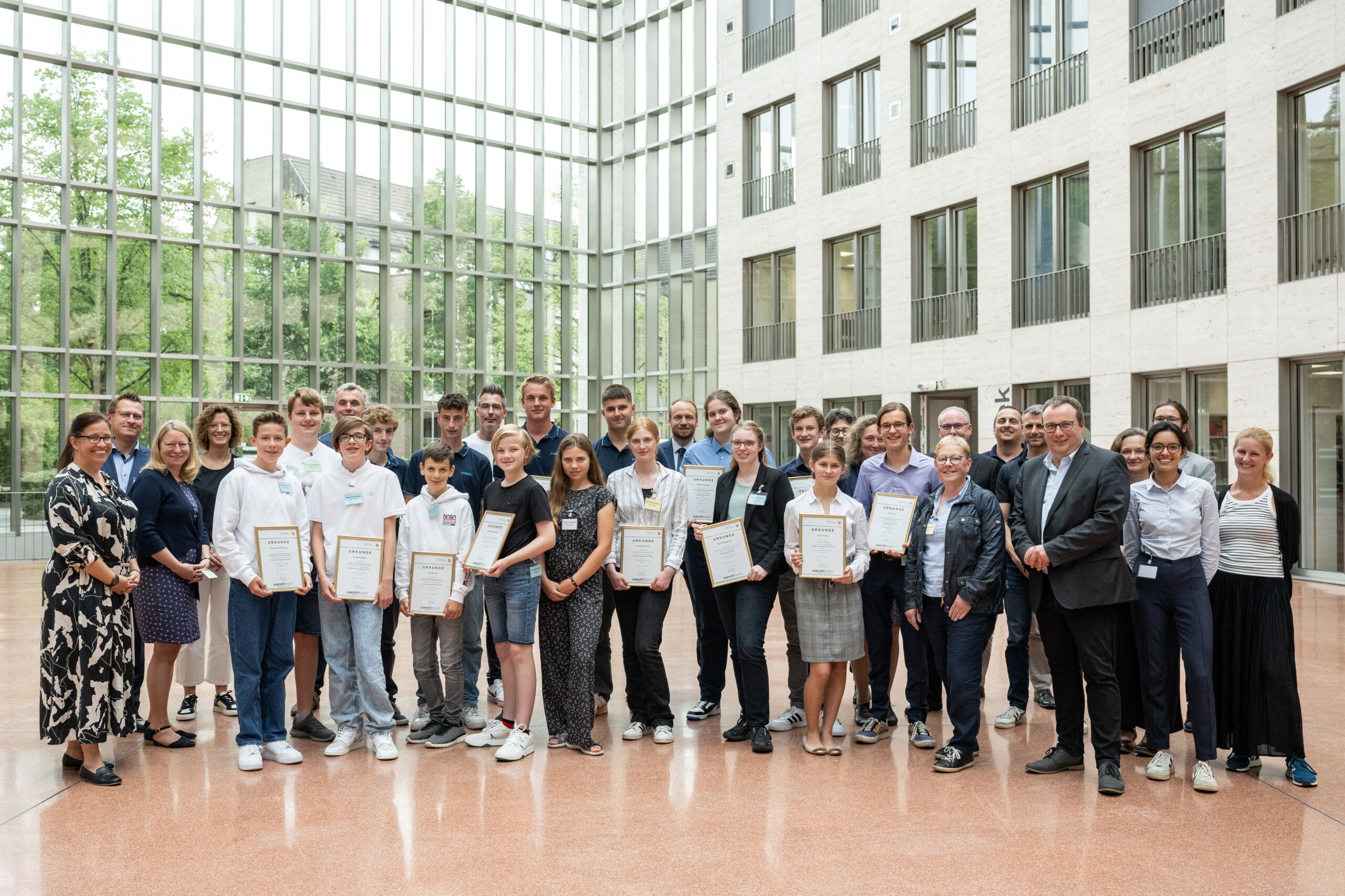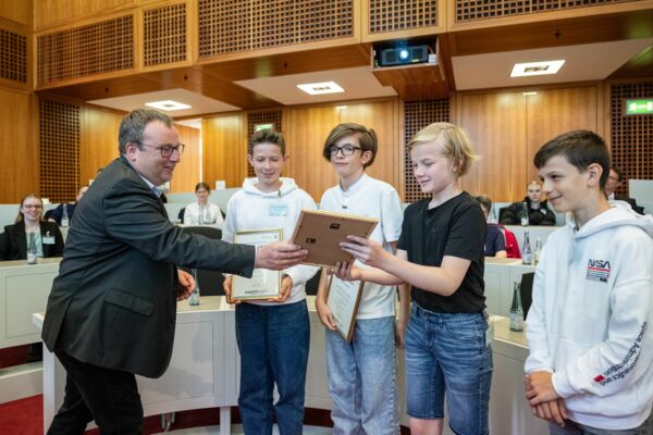 Zum 40. Mal hat das Umweltministerium im Rahmen der Landeswettbewerbe "Schüler experimentieren (10 bis 14 Jahre)" und "Jugend forscht (15 bis 21 Jahre)" den Sonderpreis Umwelt vergeben. Umweltminister Oliver Krischer überreichte am Donnerstag, 17. August 2023, Schülerinnen und Schülern aus Bad Münstereifel, Waltrop, Krefeld-Uerdingen, Alpen, Münster und Rheda-Wiedenbrück die Urkunden in Düsseldorf.