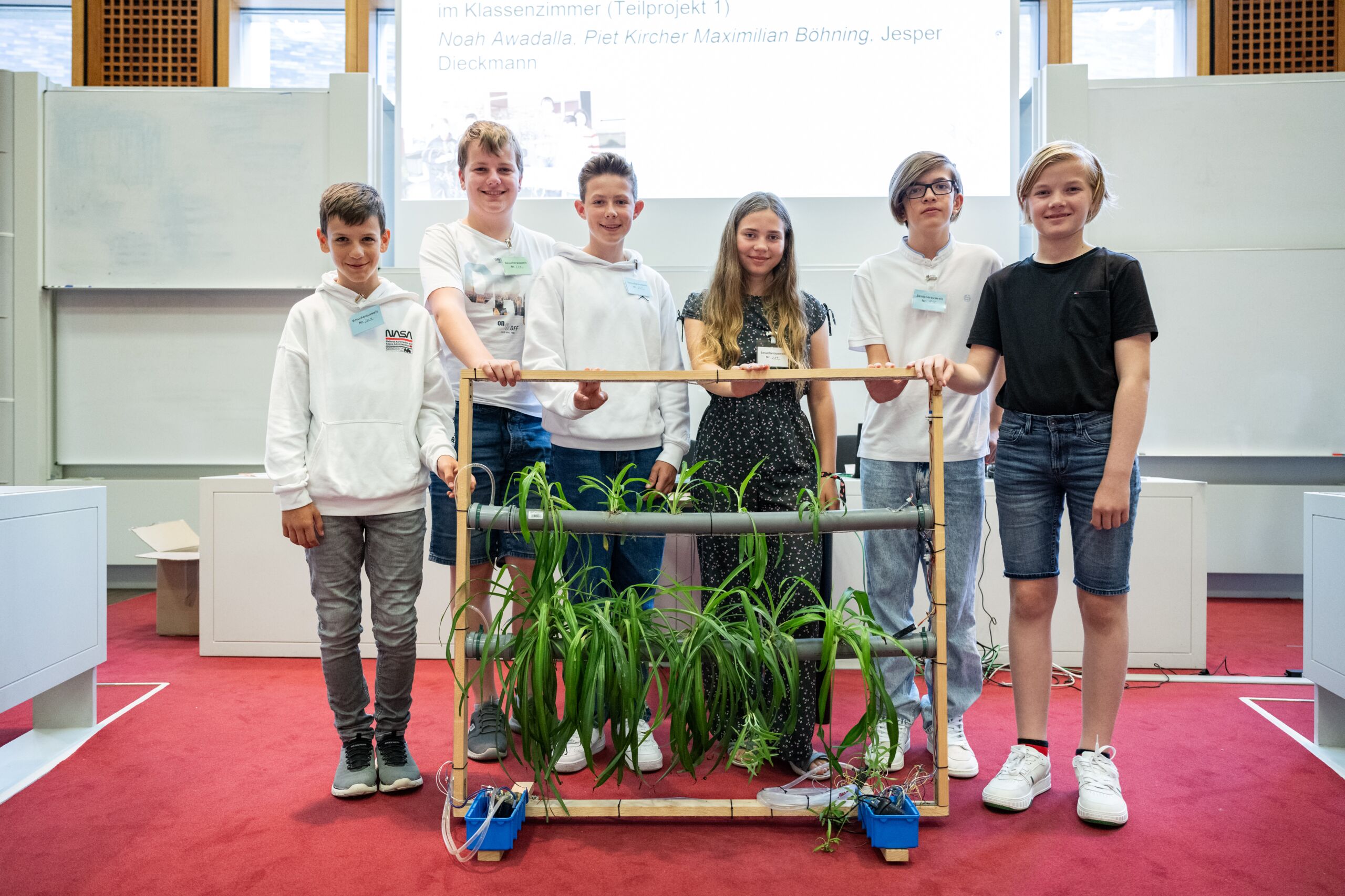 3. Preis (125 Euro): Die vier Schüler Noah A.[...], Piet K.[...], Maximilian B.[...] und Jesper D.[...] haben zusammen mit einer zweiten Projektgruppe ein System zur Begrünung von Klassenzimmern entwickelt. Mit technischem Geschick haben sie ein Gestell mit integrierten Röhren konstruiert. Diese Röhren sind mit einem mineralischen Substrat gefüllt, in das Grünlilien gepflanzt wurden. Die Röhren werden automatisch bewässert und mit Nährstoffen versorgt. Auch die Beleuchtung wird automatisch gesteuert. Mit dieser Entwicklung wollen sie die Atmosphäre und Luftqualität im Klassenzimmer verbessern. Auch andere Räume lassen sich damit ausstatten. Nicht nur an sommerlichen Hitzetagen stellt diese Entwicklung so einen Beitrag zur nachhaltigen Luftreinhaltung in Innenräumen dar.