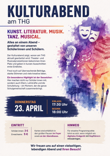 Alles an einem Abend - gestaltet von unseren Schülerinnen und Schülern. Der Kulturabend zeigt, woran am THG aktuell gearbeitet wird: Theater- und Musicalproduktionen bekommen ihren Platz und geben in kurzen Ausschnitten erste Einblicke. Freut euch auf überraschende Beiträge, starke Stimmen und viele kreative Ideen.