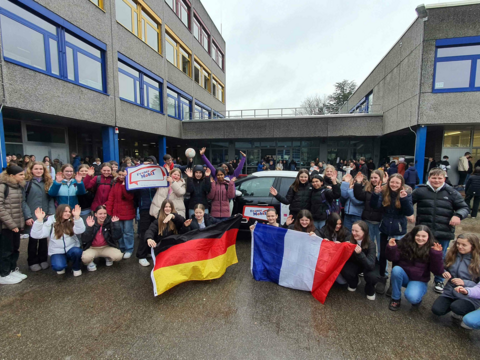 Schüler*innen der 7. und 8. Klassen vom THG Waltrop begrüßen FranceMobil, das Programm, das Frankreich vom Klassenzimmer aus interaktiv entdecken lässt.